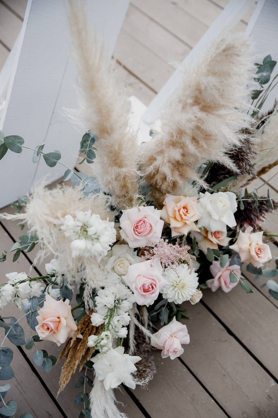 Самое трогательное это, конечно же, церемония. В ЗАГСе с нами никого не было, а тут папа ведет меня к жениху, а он стоит такой счастливый — это надо было видеть. Мы обменивались не кольцами, а цветочными венками в стиле букета невесты, это придумал Рамиль. Он решил, что раз кольцами мы уже обменивались, нужно сделать этот момент еще более нежным и необычным.
