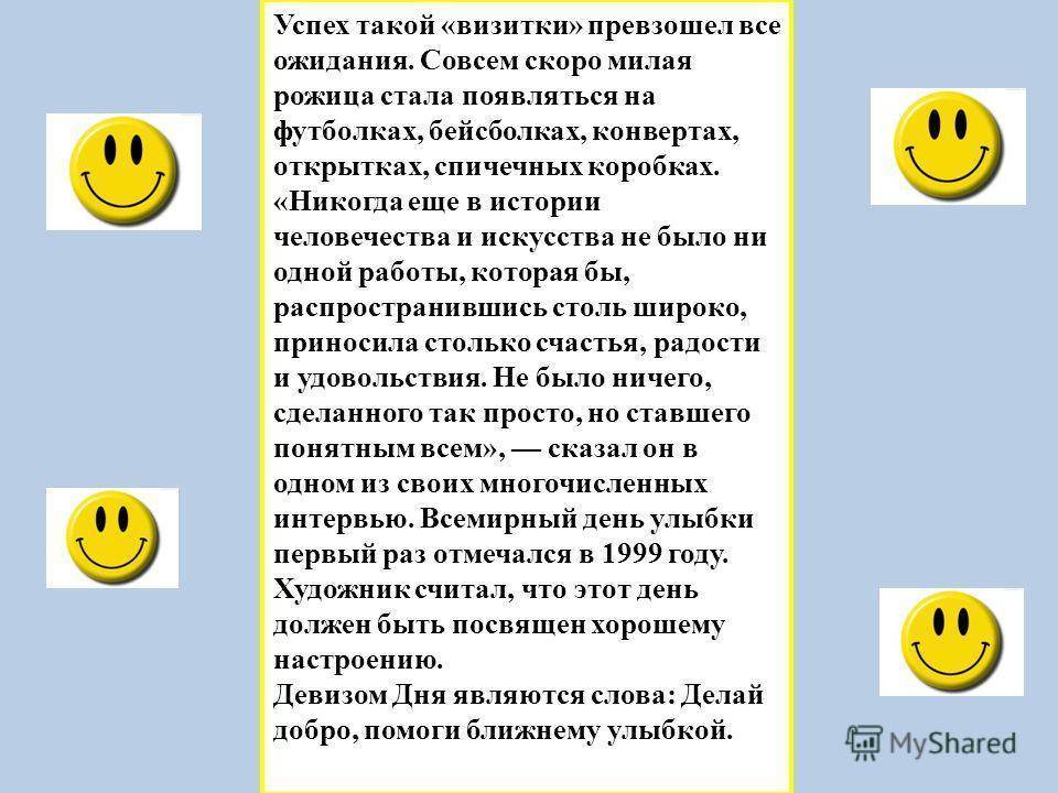 Откуда такая уверенность в успехе своей идеи у простого, мало кому известного творца? Ответ довольно прост. Концепция праздника связана с популярностью хорошо известного пользователям интернета смайлика. Ведь улыбка – это smile, а именно Бэлл придумал смешную рожицу, покорившую весь мир.