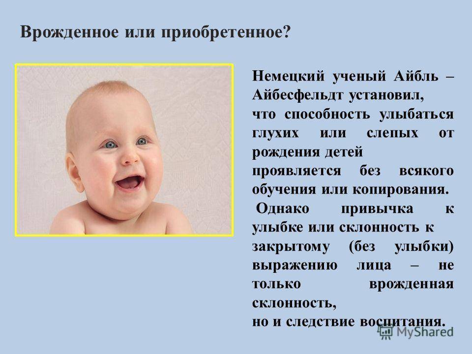 Врожденное или приобретенное? Немецкий ученый Айбль – Айбесфельдт установил, что способность улыбаться глухих или слепых от рождения детей проявляется без всякого обучения или копирования. Однако привычка к улыбке или склонность к закрытому (без улыбки) выражению лица – не только врожденная склонность, но и следствие воспитания.