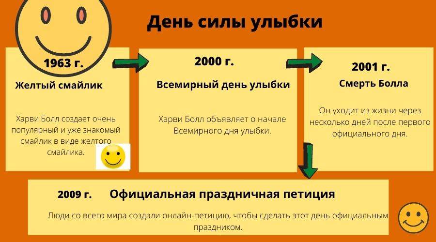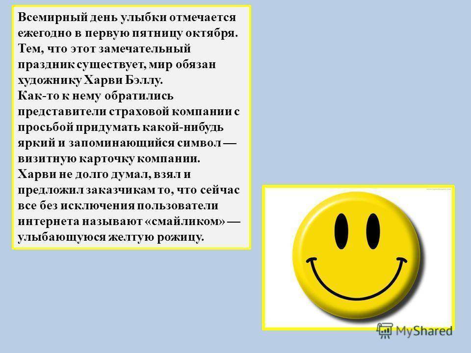 Всемирный день улыбки отмечается ежегодно в первую пятницу октября. Тем, что этот замечательный праздник существует, мир обязан художнику Харви Бэллу. Как-то к нему обратились представители страховой компании с просьбой придумать какой-нибудь яркий и запоминающийся символ визитную карточку компании. Харви не долго думал, взял и предложил заказчикам то, что сейчас все без исключения пользователи интернета называют «смайликом» улыбающуюся желтую рожицу.