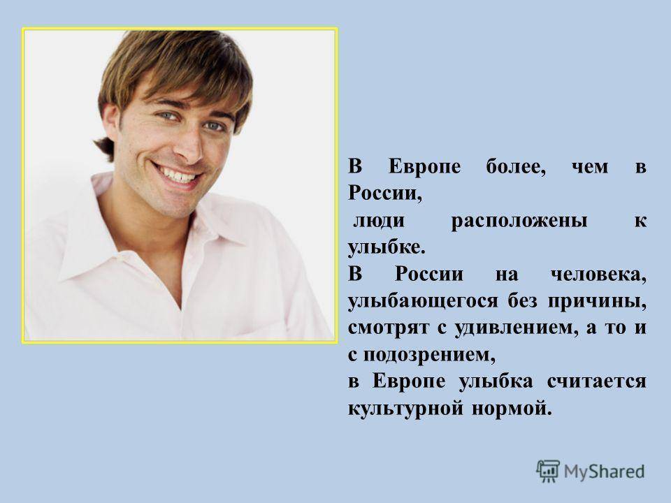 В Европе более, чем в России, люди расположены к улыбке. В России на человека, улыбающегося без причины, смотрят с удивлением, а то и с подозрением, в Европе улыбка считается культурной нормой.