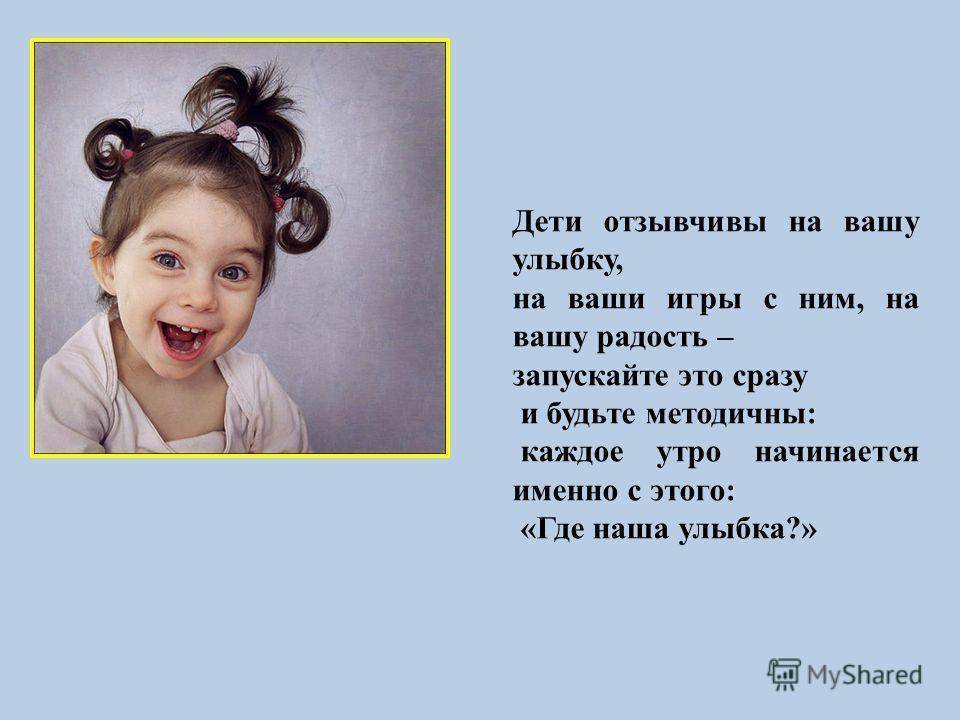 Дети отзывчивы на вашу улыбку, на ваши игры с ним, на вашу радость – запускайте это сразу и будьте методичны: каждое утро начинается именно с этого: «Где наша улыбка?»