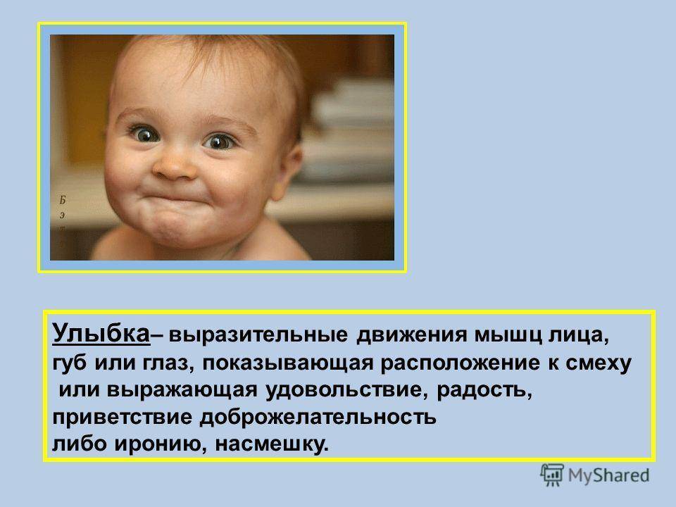 Улыбка – выразительные движения мышц лица, губ или глаз, показывающая расположение к смеху или выражающая удовольствие, радость, приветствие доброжелательность либо иронию, насмешку.