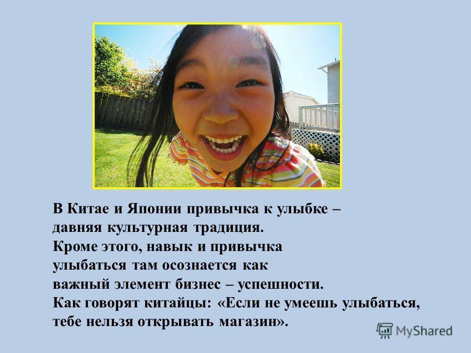 В Китае и Японии привычка к улыбке – давняя культурная традиция. Кроме этого, навык и привычка улыбаться там осознается как важный элемент бизнес – успешности. Как говорят китайцы: «Если не умеешь улыбаться, тебе нельзя открывать магазин».