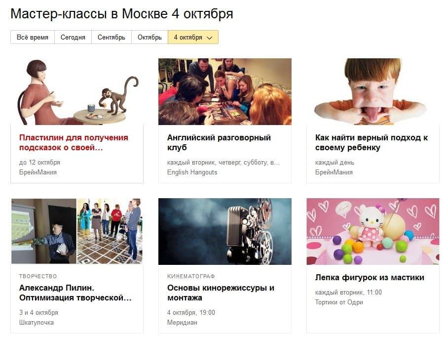 Взаимосвязь спроса и предложения бесспорна, поэтому кое-что о текущей ситуации с мастер-классами в стране можно узнать из «Яндекс Афиша». Больше всего выбор в столице. МК здесь предназначены для всех возрастных категорий и пестрят тематиками: от экспресс-курсов для начинающих сомелье до фигурного складывания праздничных салфеток.