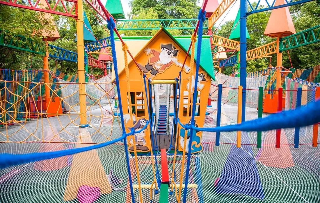 - «Башни», соединенные мостами и сетками протяженностью более 20 метров, — уникальный лазательный комплекс для детей с семи лет