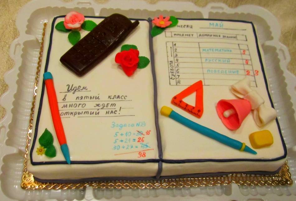 Стоит позаботиться, чтобы украшение торта напоминало о празднике. Сам торт может быть изготовлен в виде тетрадок или книги.