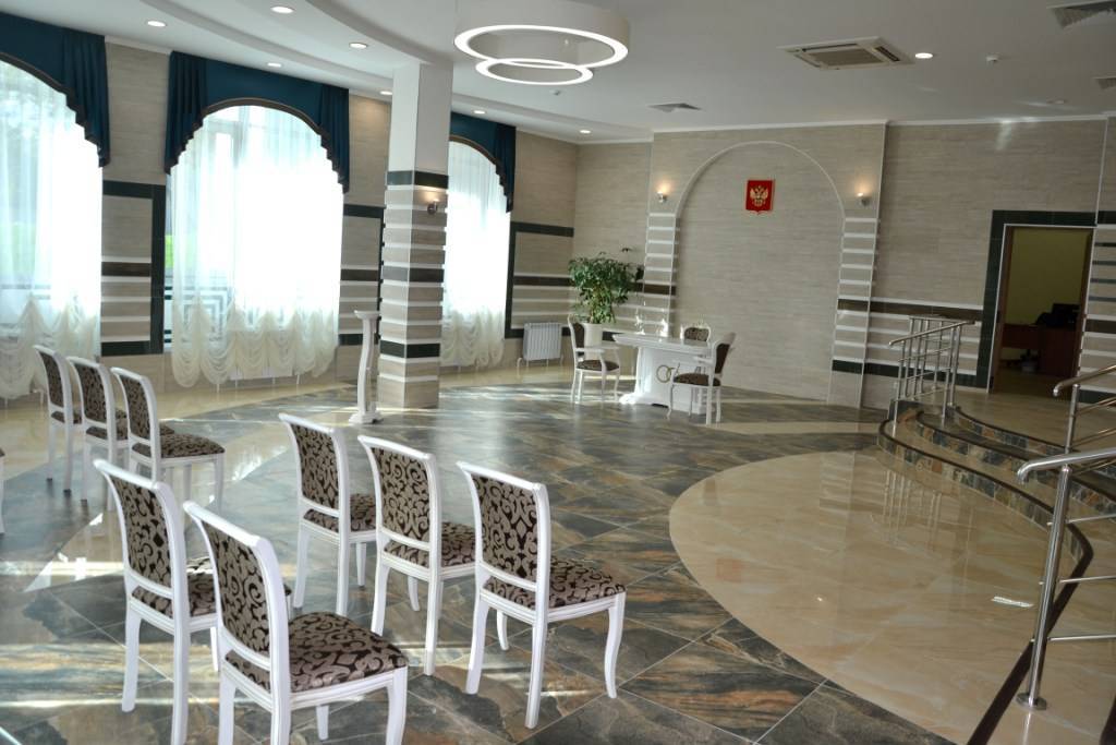 В ЗАГСе оборудовано два зала для торжественной регистрации, комнаты невесты и жениха, а также банкетный зал. На выбор брачующихся церемония проходит под звуки синтезатора или музыку струнного квартета. Главный зал оформлен в белом и золотом цветах. Мебель в классическом стиле, колонны, лепнина, зеркала в великолепных рамах и светильники “под старину”. Благодаря большим окнам и высоким потолкам здесь очень просторно и светло.