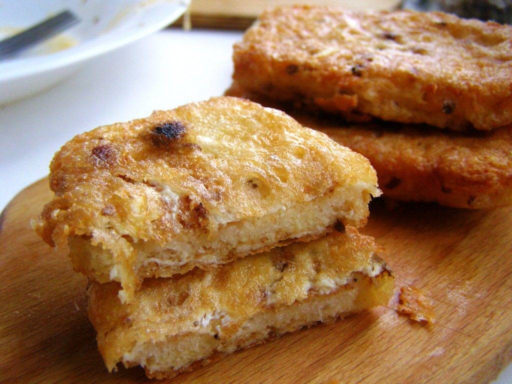 Вообще можно было все это приготовить только с участием яиц. Но у меня были названные в рецептуре продукты, я и приготовила кляр, смешав взбитое яйцо со сметаной, солью и специями, а потом и с мукой и натертым сыром. Макая кусочки хлеба в кляр, жарим в большом количестве масла.