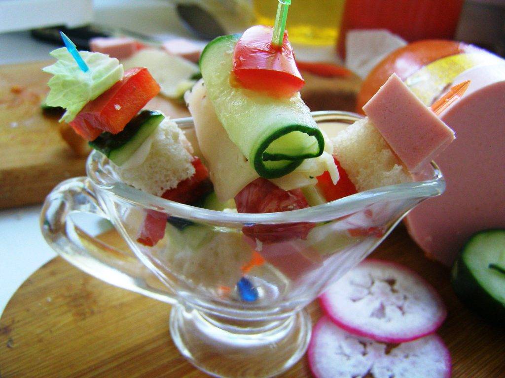 Как просто приготовить закуску из колбасы, овощей и хлеба
